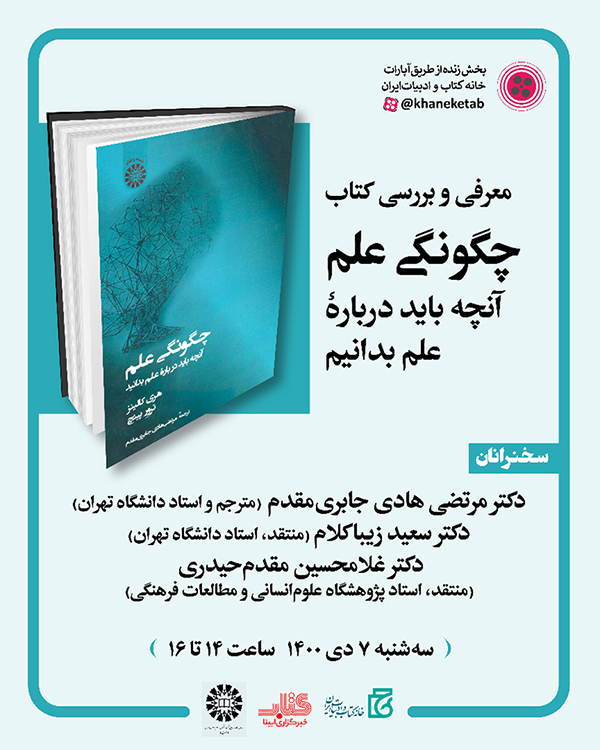 نشست معرفی و بررسی کتاب «چگونگی علم؛ آنچه باید درباره علم بدانید» تالیف هری کالینز و ترور پینچ با حضور مرتضی هادی جابری مقدم مترجم کتاب و عضو هیئت علمی دانشگاه تهران، سعید زیبا کلام عضو هیئت علمی دانشگاه تهران و غلامحسین مقدم حیدری عضو هیئت علمی پژوهشگاه علوم انسانی و مطالعات فرهنگی برگزار می‌شود.