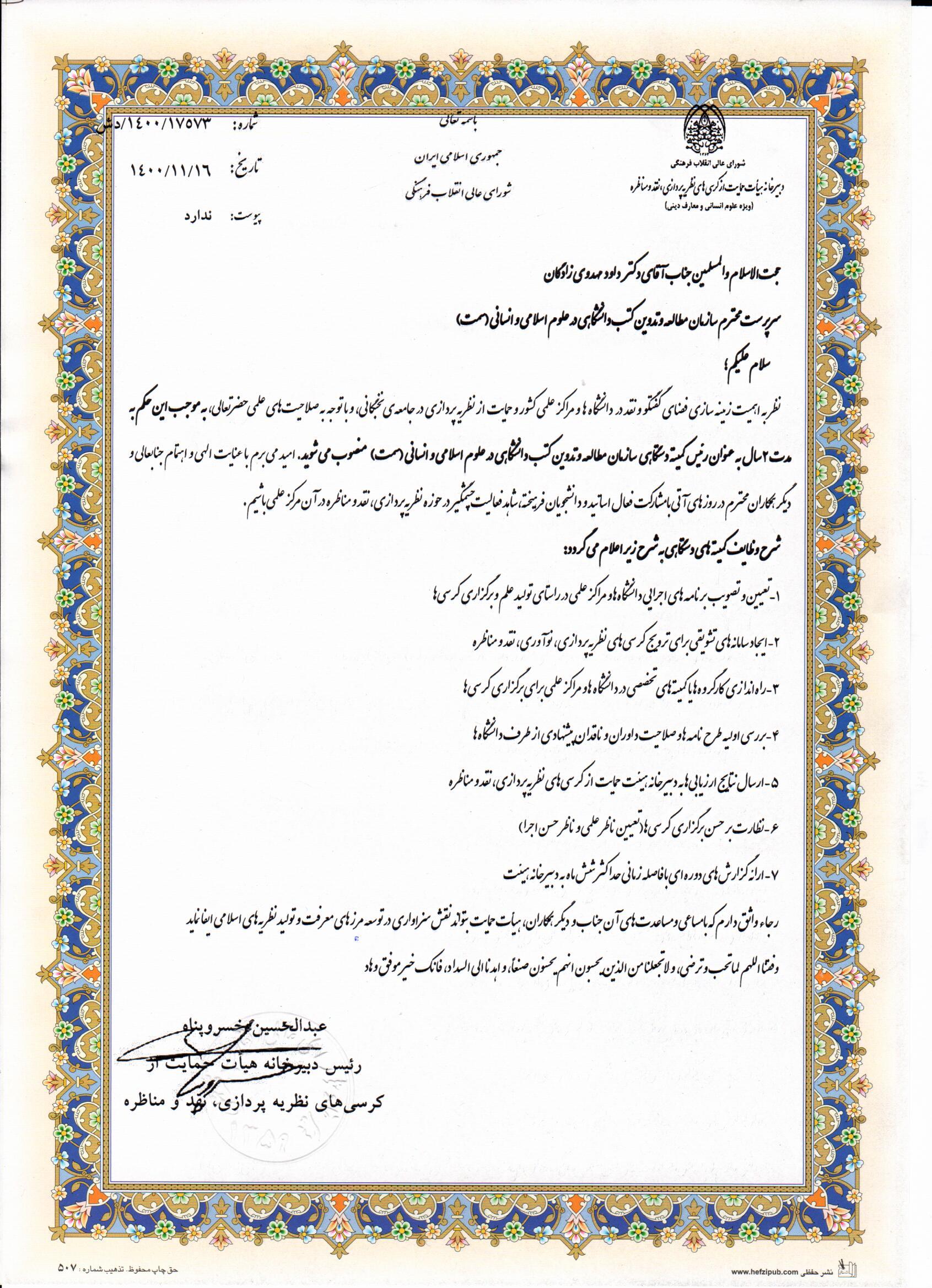 تصویر حکم دکتر مهدوی‌زادگان: