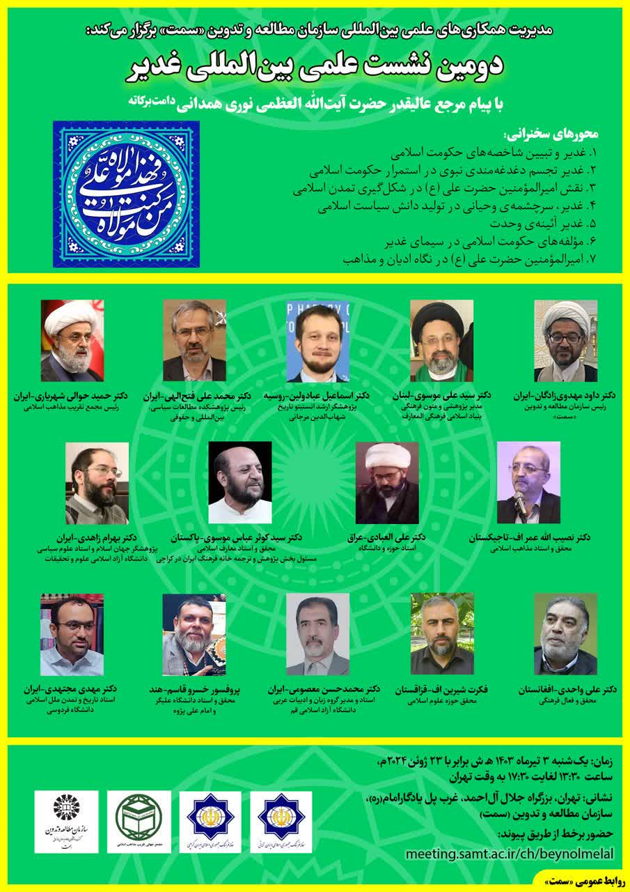 به گزارش روابط عمومی «سمت»، به همت مدیریت همکاری‌های ‌علمی ‌بین‌المللی سازمان مطالعه و تدوین دومین نشست علمی بین‌المللی غدیر برگزار شد. این رویداد علمی با پیام مرجع عالیقدر آیت الله العظمی نوری همدانی آغاز شد و در ادامه چهارده چهره علمی از کشورهای ایران، لبنان، روسیه، تاجیکستان، عراق، پاکستان، افغانستان، قزاقستان و هند به صورت حضوری و مجازی سخنرانی خود را ارائه کردند.
